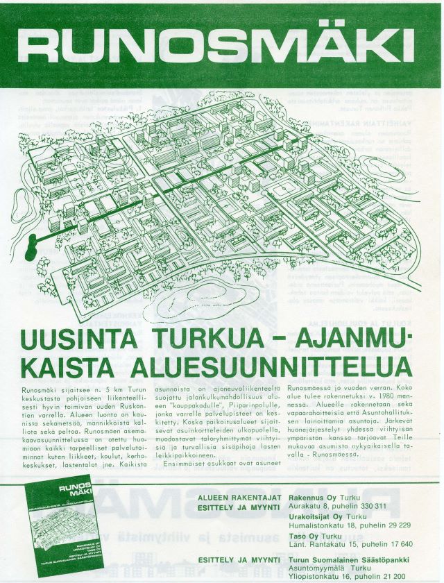 Toisen maailmansodan jälkeen Suomea rakennettiin hyvinvointivaltioksi. Tavoitteena oli rakentaa joka perheelle hyvä asunto, ja vuosina 1966 - 1974 toteutettiin puoli miljoonaa asuntoa. Kerrostalovaltaisten lähiöiden aluerakentaminen omaksuttiin asuntotuotannon päämuodoksi arkkitehtien, insinöörien, rakentajien ja rahoittajien yhteistyönä. Modernistinen arkkitehtuuri sopeutui suurtuotantoon ja kansainvälisiä esikuvia sovellettiin. Runosmäki on Turun toiseksi suurin aluerakentamiskohde, joka rakennetiin pääosin 1970-1980. Tietokirjailijat Laaksonen ja Aalto ovat yhdessä kirjoittaneet kirjan Turun lähiöt (2021) ja Aalto kirjan Runosmäki - Maarian takamaasta asumalähiöksi (2022). Laaksonen kertoo lähiöiden yleisestä historiasta ja Aalto enemmän Runosmäestä.